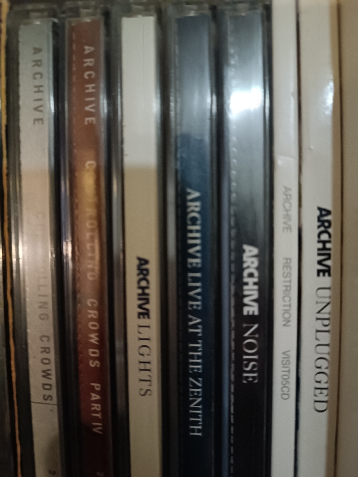 The image displays a collection of Archive band CDs. From left to right, titles visible are: "Controlling Crowds," "Controlling Crowds Part IV," "Lights," "Live at the Zenith," "Noise," "Restriction Visit05CD", and "Unplugged." The spines are oriented vertically. Each features the word "Archive." The covers vary in color, ranging from light grays and white to darker browns and blues.
