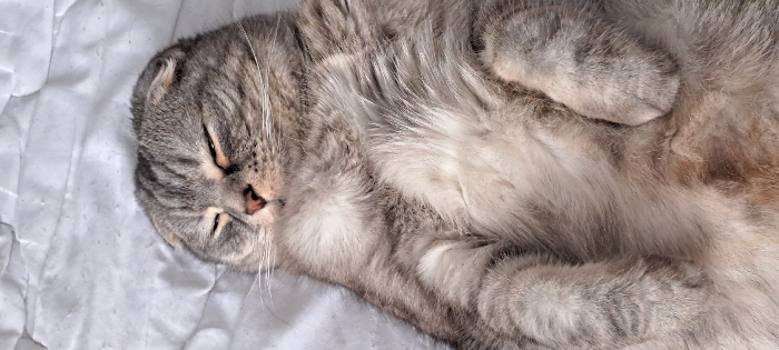 - "A domestic cat, identified as a grey tabby Scottish Fold, is depicted lying supine with its eyes closed, indicative of sleep or deep relaxation" by FM-FrnGi2, licensed under CC BY 4.0