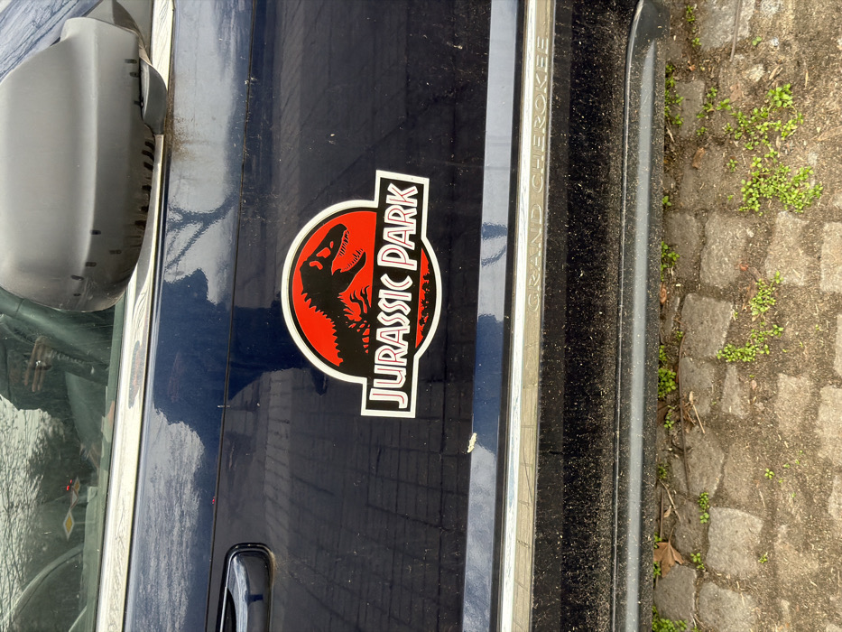 A dark blue Jeep Grand Cherokee is parked on an irregular cobblestone surface in the city of Plovdiv, Bulgaria. A circular "Jurassic Park" logo sticker, featuring a black Tyrannosaurus Rex silhouette on a red background with white and black outlines and text, is affixed to the passenger-side front door. The vehicle's paintwork is visibly dusty and shows streaking, particularly on the door panel and the black plastic side mirror housing. The words "GRAND CHEROKEE" are embossed on the vehicle's lower side trim. Reflections on the vehicle's window and bodywork include an individual wearing a dark garment with a ring on their left hand, and a bare tree branch. Small green plants and a single brown, dried leaf are present on the cobblestone ground.