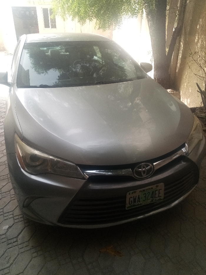 The scene is set in Tudun Wada, Nigeria. A silver four-door sedan, identified as a Toyota model by its emblem, is parked on an outdoor surface composed of grey interlocking pavers. The vehicle faces the viewer at a slight angle towards the left, with its front bumper and hood prominently visible. The license plate, centered on the front bumper, reads "GWA-324EE" with "ABUJA, NIGERIA" above the numbers. The car's headlights are visible and appear intact. To the left of the vehicle, more of the geometric patterned pavers extend, leading towards a light-colored building with a single rectangular window visible on its upper facade. To the right of the vehicle, a tree with a visible trunk and sparse green foliage stands, casting shadows on a light-colored, possibly stuccoed, wall behind it. Sunlight appears to originate from the right or rear-right, creating bright reflections on the car's windshield and hood, and casting distinct shadows on the ground and wall. No individuals or active subjects are present in the frame.
