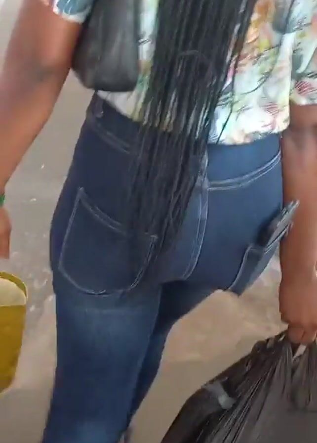 A woman with long braids is walking away from the camera. She is wearing a floral top, blue jeans, and carrying a black purse. She is also carrying a yellow shopping bag in one hand and a black bag in the other. A mobile phone is visible in her back pocket. The location appears to be a public space.