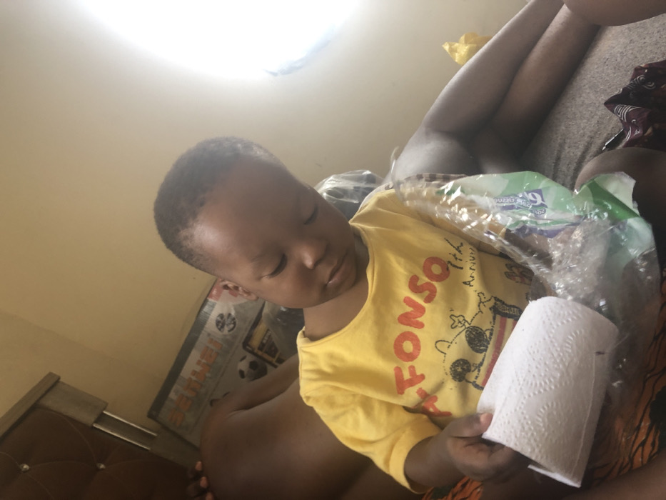 A young child in a yellow shirt with “ALFONSO” printed on it sits with a roll of toilet paper in hand. The child looks down at the toilet paper. To the child's left are a packaged bag of sweets and a box decorated with a soccer ball. The child is sitting on someone's lap, and the background shows part of a bed and a light fixture above.
