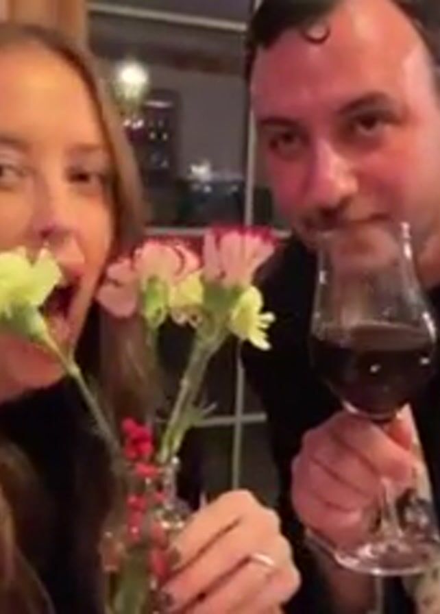 A woman with long brown hair and a black top stands at a restaurant table and opens her mouth wide toward a small vase with green and red flowers. Next to her, a man with dark hair, a mustache, and a black blazer holds a glass of dark red liquid. A window and a painting are visible in the background. The setting appears to be indoors in a restaurant.