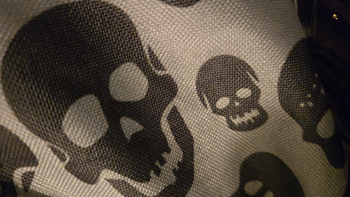 The scene, situated in Lompoc, United States, depicts a close-up, angled view of a textured textile surface patterned with multiple skull motifs