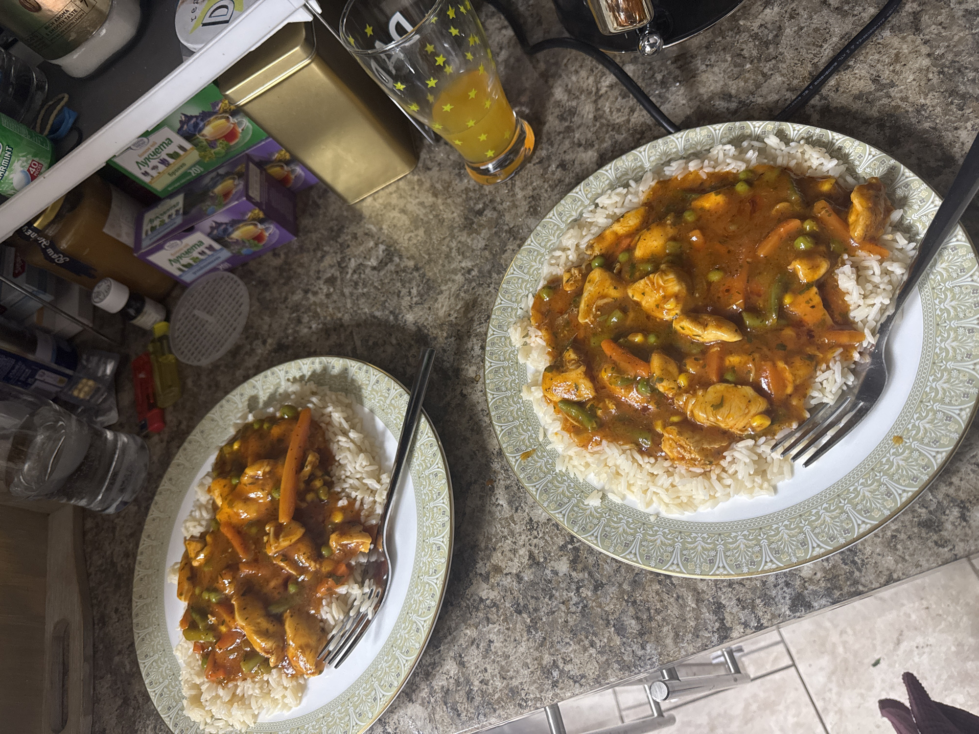 The image depicts an indoor kitchen or dining area within a private residence in Unknown, Unknown. Two prepared meals are centered on a speckled brown and grey countertop. Each meal consists of a white oval plate with an ornate green and gold rim, holding a mound of white rice topped with chicken stew containing chicken pieces, carrots, peas, and other vegetables in a reddish-orange sauce. A silver fork is placed on each plate. To the upper left, a clear glass filled with water and ice is present, alongside red and yellow disposable lighters. In the upper right background, a variety of kitchen items are visible on a shelf or inside an open refrigerator. These include a jar of "Raw Honey," three purple boxes labeled "ЛУКЧЕТА" (Lukcheta), a gold metal tin, a green container of "SPEARMINT" product, other bottles, and a white tub. A clear glass tumbler with yellow star decals, containing a yellow-orange liquid, sits to the right of the lower plate. The lower left corner reveals the edge of a light-colored tiled floor with a metallic support, and a dark, possibly gloved, hand partially visible at the very bottom. No individuals are actively interacting with the meals.
