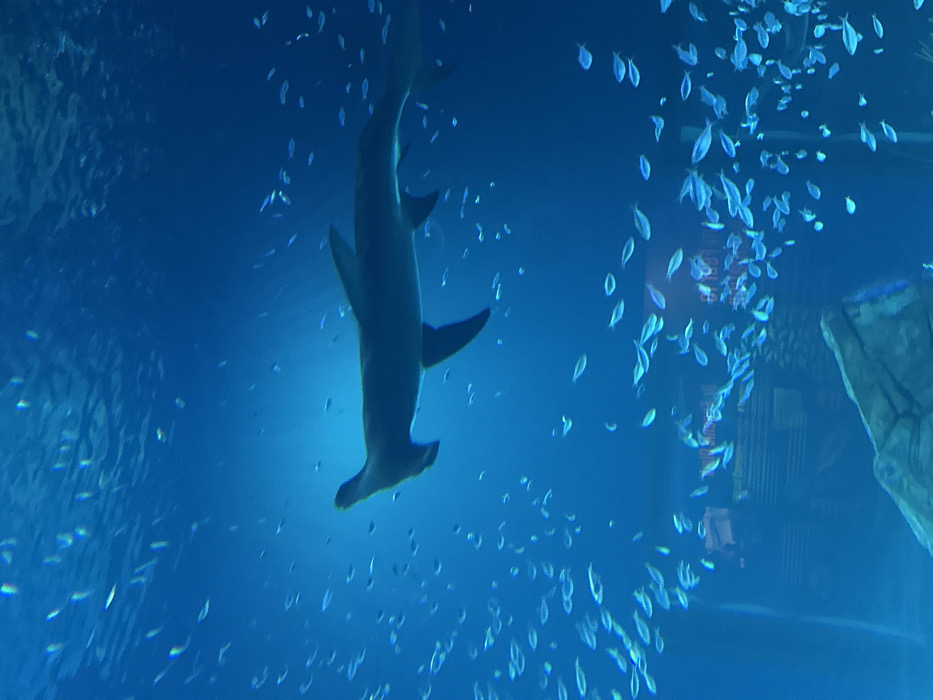 A hammerhead shark swims vertically downward in a blue aquarium. Numerous small fish swim around it, and bubble trails indicate water aeration. The lighting is bright behind the shark, silhouetting the creature. Replicated coral structures are visible on the sides. The shark appears to be the focal point of the display.