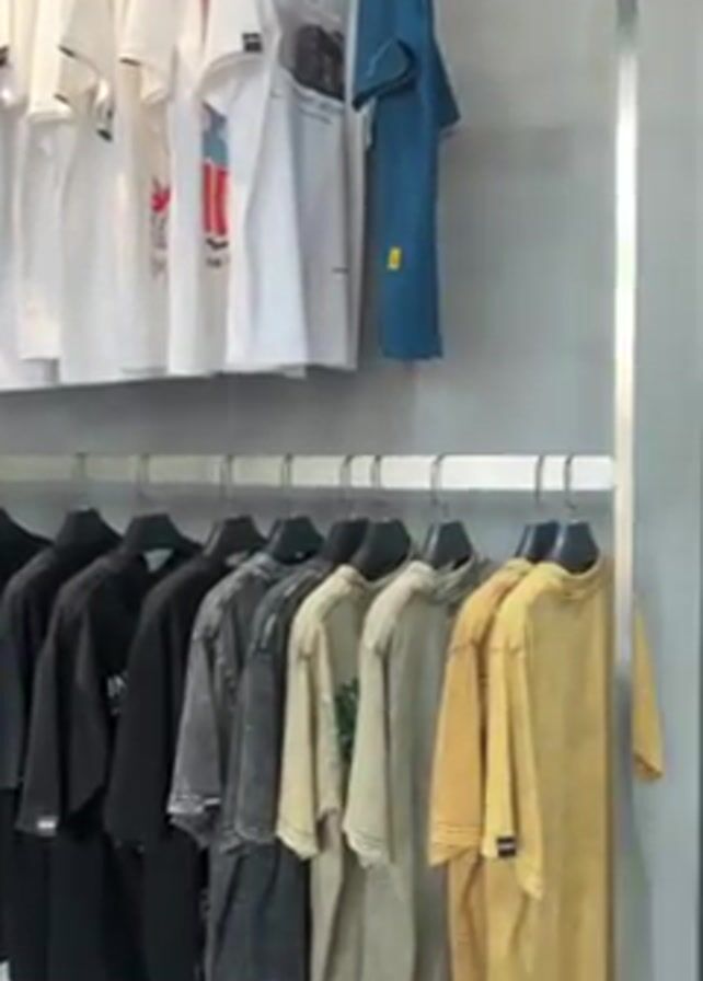 The camera pans through a modern clothing boutique. Two racks of t-shirts are seen, the top rack holds light-colored shirts and the bottom rack has dark-colored shirts. The camera then pans to a wall where multiple racks with various clothing hang, including white, green, brown, pink, red, and black garments. At the end of the view, a gray cylindrical table displays various hats.