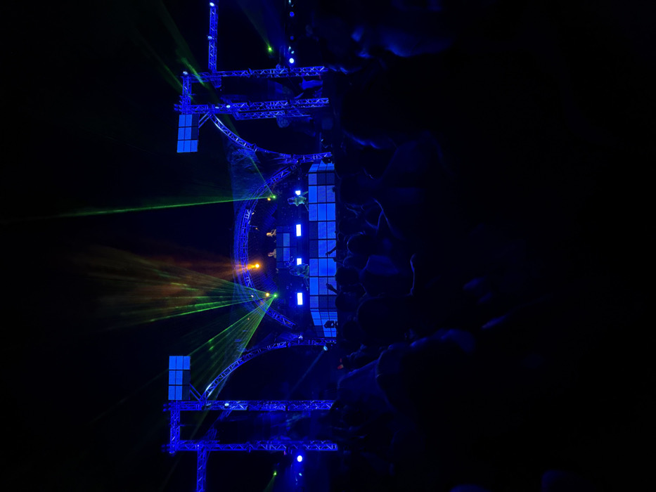 The image depicts a concert stage illuminated with vibrant green, orange, and blue lights. A circular structure serves as a central focal point, with beams of green laser light radiating outwards. The stage is framed by blue-lit scaffolding. Silhouettes of a crowd are visible on the right side of the frame, adding a sense of depth and energy to the scene. The overall effect is a dynamic and electrifying atmosphere, indicative of a live music performance.