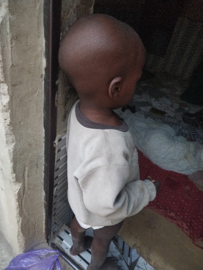 A small, bald child stands inside a doorway, turned away from the camera. The child wears a light-colored, long-sleeved shirt with a dark collar. The child's skin is dark. The doorway frame appears weathered, and a dark metal grid is visible beneath the child's feet. Inside, a red rug and a white fabric are partially seen. A purple plastic bag sits near the entrance.