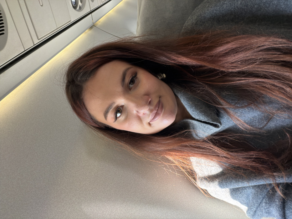 A forensic examination of the image reveals a medium close-up portrait of an adult female subject situated within the passenger cabin of an aircraft