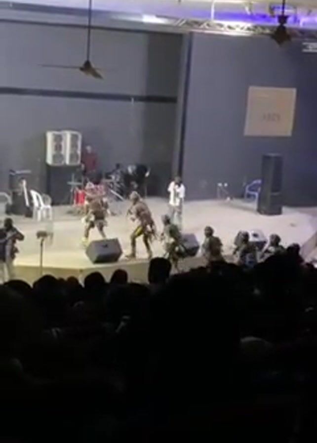 A performance is taking place on a stage. The stage has a band at the back, with musicians playing instruments. In the front of the stage, there are 8 people in military-style uniforms, some with helmets, dancing as part of the show. There is a man in a white shirt standing in the middle of the stage, presumably a singer or speaker. In front of the stage, there is a large crowd of people watching the performance. The room appears to be a large hall or auditorium, with dim lighting and ceiling fans. There are speakers on either side of the stage and a sign that says ARIN in the background. A person near the stage is filming the performance on a phone.