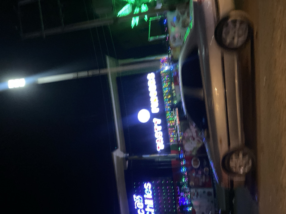 A sideways image at night shows a car parked on the side of the road in front of a brightly lit storefront. The storefront has colorful lights and displays, with signs reading "Tasty Princesses" and "Cafe Chillies." A street light is visible in the upper left corner. A green, tree-shaped light is also noticeable in the background, contributing to the lively atmosphere.
