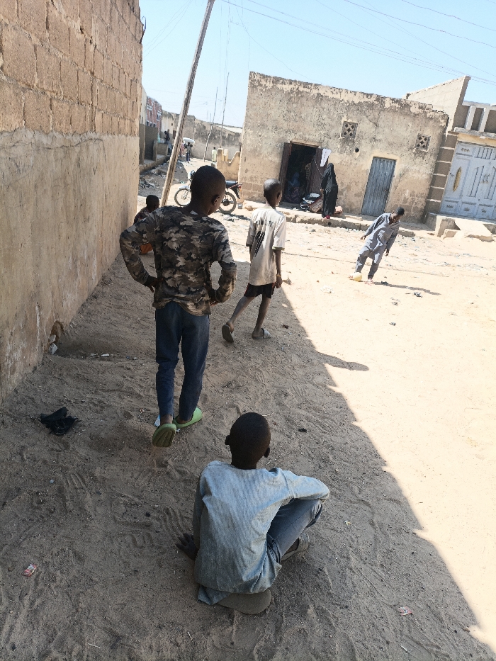 The image depicts an unpaved street in Dakata, Nigeria, under clear skies and bright daylight, casting distinct shadows. The street surface is composed of sand and dirt. On the left, a light-colored brick wall with exposed sections runs parallel to the viewer. On the right, several single-story buildings with rough-textured, light-colored walls are visible; one features an open doorway with a dark-clad figure standing inside, and another has a blue-painted wooden door. Further down the street, a building with a patterned metal gate is visible, along with a motorcycle parked near another structure. A wooden utility pole with wires extends from the mid-ground towards the background. In the foreground, a young male, dressed in a light blue long-sleeved shirt and blue jeans, sits on the ground with his back to the camera. His footwear is indistinct. Slightly ahead of him, another young male stands facing away from the camera, wearing a camouflage-patterned long-sleeved shirt, blue jeans, and light green slides. His hands are on his hips. To his right, a third young male walks away from the camera, wearing a light-colored t-shirt with a dark graphic on the back and dark shorts. Further to the right, a fourth individual, dressed in a light gray long-sleeved tunic, is actively engaged with a light-colored spherical object (a ball) on the ground, leaning forward as if kicking it. In the mid-ground, near the left wall, a pair of black sandals or shoes are discarded on the ground. A small, reddish wrapper or piece of debris is visible on the ground near the seated boy. In the background, additional indistinct figures are visible on the street.