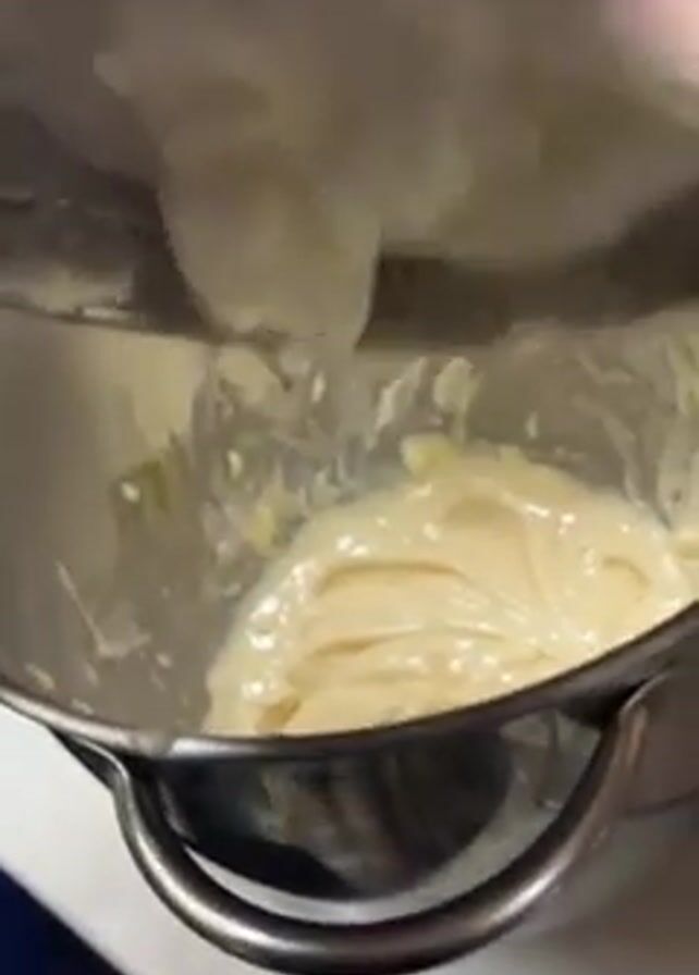 A stainless steel mixing bowl sits on a table, containing a thick, yellow batter. A person is shown pouring a white, fluffy mixture from another stainless steel bowl into the bowl with the batter. The fluffy mixture gently falls into the batter. The background is blurry and out of focus.