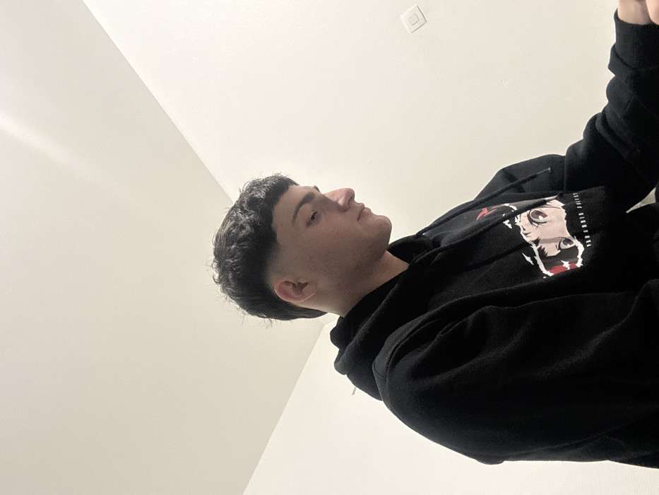 A young adult male is depicted in a medium-close profile view within an indoor setting in Ostwald, France. He is positioned facing towards the right side of the frame, looking downwards. The individual possesses dark, curly hair styled with a short, tapered fade on the sides and back, and a fuller, textured top. His facial features include a prominent nose and clear skin. He is wearing a black hooded sweatshirt. The front of the sweatshirt displays a graphic print featuring anime-style eyes with red irises, consistent with the character Tanjiro Kamado from Demon Slayer, along with partially visible white text below. The background is a plain, light-colored wall. A white square-shaped electrical outlet or switch plate is affixed to the wall on the right side of the frame. The lighting suggests an interior environment. No other individuals or objects are discernible within the visible area.