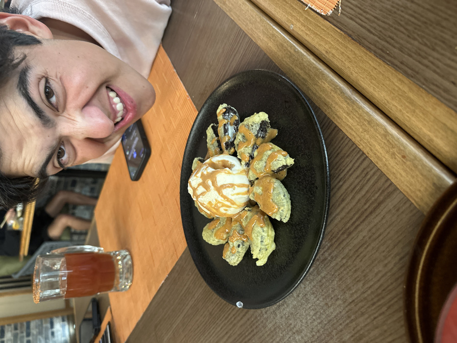 A person smiles beside a plate of battered and fried Oreo cookies. Vanilla ice cream is in the center of the cookies, drizzled with caramel sauce. A clear mug with an amber-colored drink is to the left of the plate. The items sit on a table with a wooden surface and orange placemat. A mobile phone rests next to the placemat.