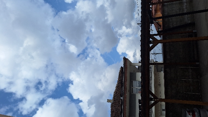 The image depicts an outdoor scene in Dolni Chiflik, Bulgaria, under a partly cloudy sky. The upper half of the frame is dominated by a blue sky interspersed with numerous white cumulus clouds; a faint "X"-shaped contrail is visible within a clear blue section of the sky. In the foreground and midground, a dark, wooden pergola or carport structure is prominent, featuring robust horizontal beams and vertical posts, casting a shaded area. Below this structure, a silver automobile's rear bumper and a portion of its trunk are visible on the left. Directly behind the pergola, a dark, textured concrete wall extends horizontally across the scene. A multi-sectional metal rack is mounted onto this wall. Above and behind the concrete wall, architectural elements are visible. To the left, a multi-story building with a terracotta-tiled roof and a chimney is present. Its upper section features white exterior walls, a window with reflective glass, and a balcony supported by white pillars. To the right, another building with an orange-colored facade and a terracotta-tiled roof is partially visible beyond the concrete wall. Several thin, dark horizontal wires, consistent with utility lines, are strung across the midground above the wall and pergola, extending to the right. No individuals are present or engaged in any actions within the frame.