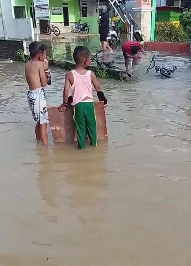 flooded residential street. The water is murky and brown. Several children are playing in the water. Two young boys, one without a shirt and the other in a pink tank top and green pants, are standing near a rectangular piece of wood. Other children, including some girls, are scattered throughout the flooded area, some sitting in the water. There are bicycles partially submerged in the flood. Buildings can be seen in the background, including one with the sign "BLOK C." A metal gate is also visible.