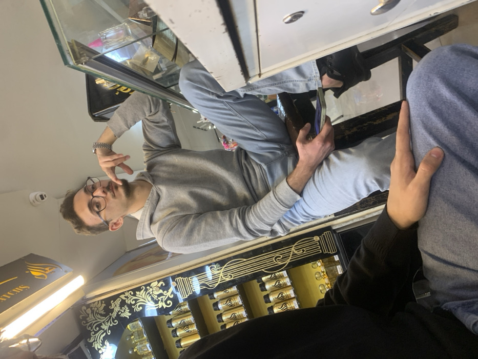 The image depicts the interior of a retail establishment located in Barza Municipality, Syria. In the center, a young adult male, likely in his early twenties, is seated on a dark wooden stool. He has short dark hair, wears eyeglasses, a faint goatee, a grey hooded sweatshirt with a small white logo on the left chest, light blue jeans, and black athletic shoes. A silver-colored watch is visible on his left wrist. His right hand holds a blue-cased smartphone, while his left hand is raised, with fingers touching his chin/jaw area. He is looking directly towards the camera. In the lower left foreground, a second individual is partially visible from the chest down, wearing a black long-sleeved top and light blue trousers. Their right hand rests on their right thigh. To the left of the central figure, a tall, black display shelving unit features gold decorative accents, including fluted columns and scrollwork. It contains multiple rows of identical gold-colored cylindrical spray bottles, which appear to be perfumes or deodorants, each bearing black Arabic script. Below these, smaller clear and gold-colored perfume bottles are arranged. Above this unit, a partial sign with gold lettering on a black background is visible, showing the word "WATERS" (or similar ending) and Arabic text. To the right, a white-framed glass display counter is prominent, showing wear and tear with chipped paint. The glass top of the counter reflects light and contains some small, indistinct items. Overhead, a linear fluorescent light fixture illuminates the scene, and a small, white dome-shaped security camera is mounted on the ceiling in the upper center of the frame. The overall lighting is bright and artificial.