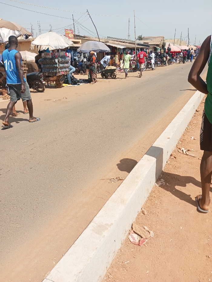 This image depicts a bustling roadside market scene in Akwanga, Nigeria, under a bright, clear sky. The central feature is a two-lane asphalt road, light grey in color, running diagonally through the frame from the lower left to the upper right. A newly installed, light-grey concrete curb separates the road from a reddish-brown dirt shoulder on the right, which shows some scattered debris including a torn piece of red and white paper or packaging. On the left side of the road, a vibrant market stretches into the distance. Numerous individuals, primarily adults, are visible. In the immediate left foreground, a dark-skinned male wearing a blue sleeveless top with the number "10" on the back and dark shorts, along with flip-flops, walks from left to right across the road. Another person's legs are partially visible behind him. On the far right, partially cropped, stands a dark-skinned individual wearing a green sleeveless top, dark shorts, and flip-flops. Along the market side, makeshift stalls are set up, featuring various items for sale. White and blue umbrellas provide shade over vendors and merchandise. One prominent stall on the left displays numerous packaged goods stacked high on a cart, possibly snacks, under a white umbrella. Nearby, a black motorcycle is parked. Further into the scene, individuals are seen interacting around the stalls. A person in a red shirt with the number "18" on the back walks away from the viewer, while another in a light green outfit also walks away. A wheelbarrow filled with what appears to be yellow produce is visible near one of the stalls. The market is lined with single-story structures with various roofing materials, including corrugated metal, and utility poles with overhead lines are visible in the background. Shadows cast by people and objects indicate strong sunlight from an unseen source.