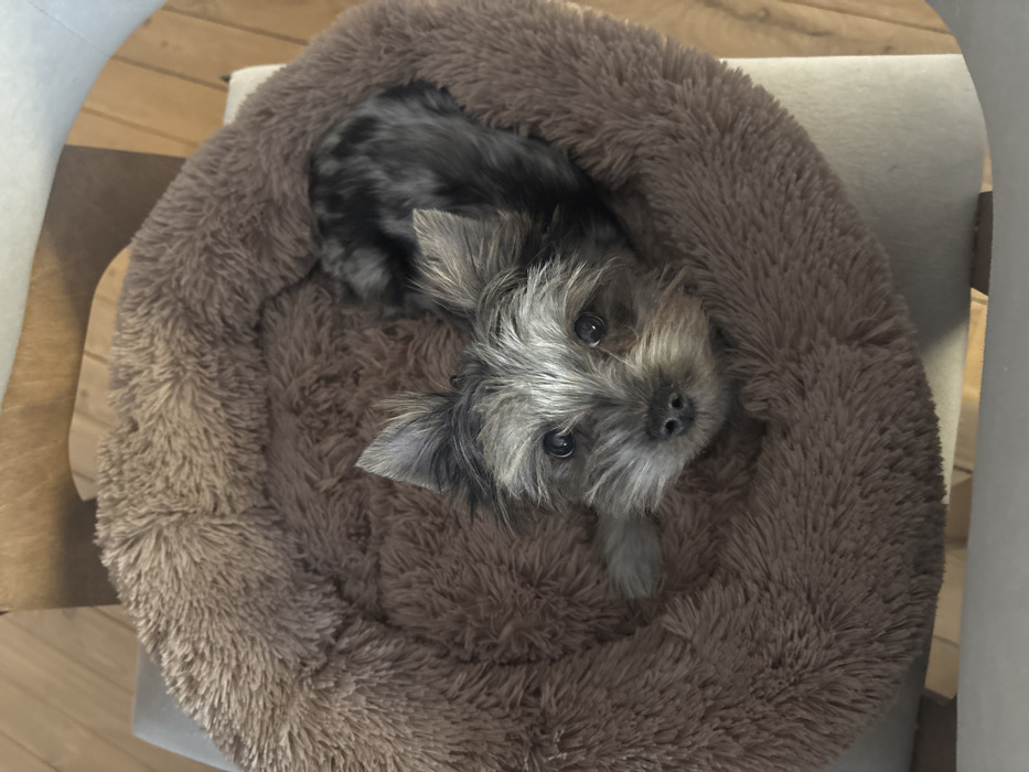 - "An overhead view captures a small dog resting within a circular, fluffy, brown pet bed" by FM-kirZf2, licensed under CC BY 4.0