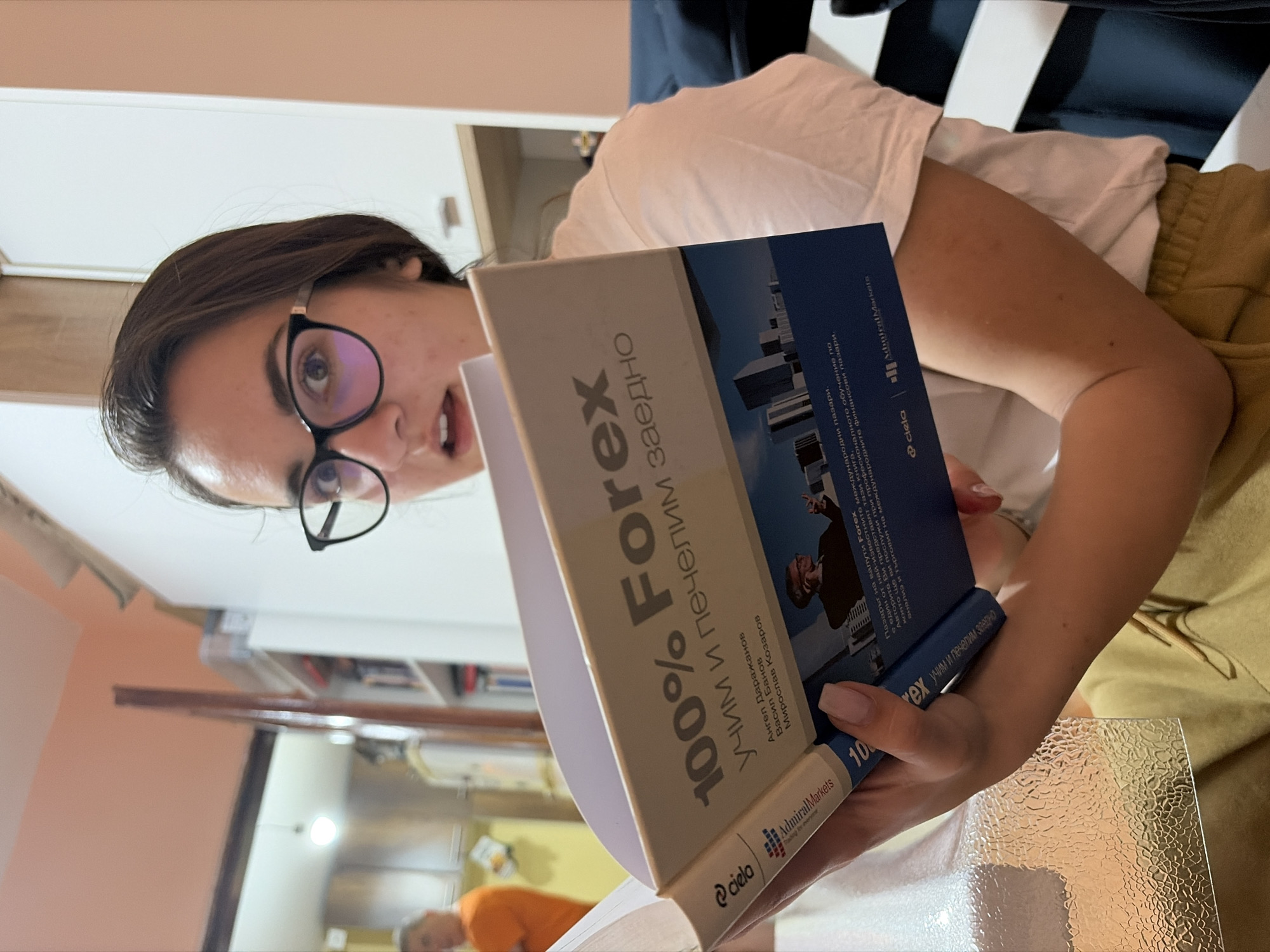 Here's a detailed description of the image: **Scene:** An indoor shot captures a young woman holding a book in front of her. **People:** A young woman with dark hair and wearing black-rimmed glasses is holding the book. She is wearing a white t-shirt and light brown pants. Part of another person wearing an orange shirt can be seen in the background, near the bottom of the image. **Objects:** The central object is a book titled "100% Forex, учим и печелим заедно" (100% Forex, we learn and earn together). The book is mostly white with blue on the front and side. Text on the book identifies "Angel Darazhanov, Vasil Banov, Miroclav Kosarov" as the authors. There is the logo of "Admiral Markets" and "@ciela" visible. Other visible objects include a table with a textured, possibly glass, surface in the foreground, and shelves filled with books in the background. A white cabinet is also visible behind the woman. **Actions and Interactions:** The woman is holding the book and seems to be looking at it, possibly reading or showing it to the viewer. **Environment:** The setting appears to be inside a home, possibly a living room or study, given the presence of bookshelves and cabinets. **Location:** While the text on the book is Bulgarian, providing a language clue for the country of origin, there's no explicit visual indicator within the image to confirm that it's specifically in Sofia, Bulgaria. Without further details, it's difficult to confirm the city.