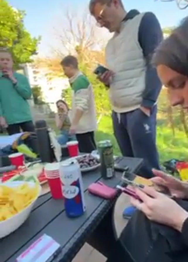 group of people gathered outdoors, seemingly at a social gathering or party. Several individuals are standing or sitting around a table laden with food and drinks, including chips, meat, a bowl of what appears to be chestnuts, red cups, cans of drink, and a bottle of wine. Some people are looking at their phones. The overall atmosphere appears relaxed and casual. The setting is a backyard or garden area, with trees, buildings, and a clear blue sky visible in the background.