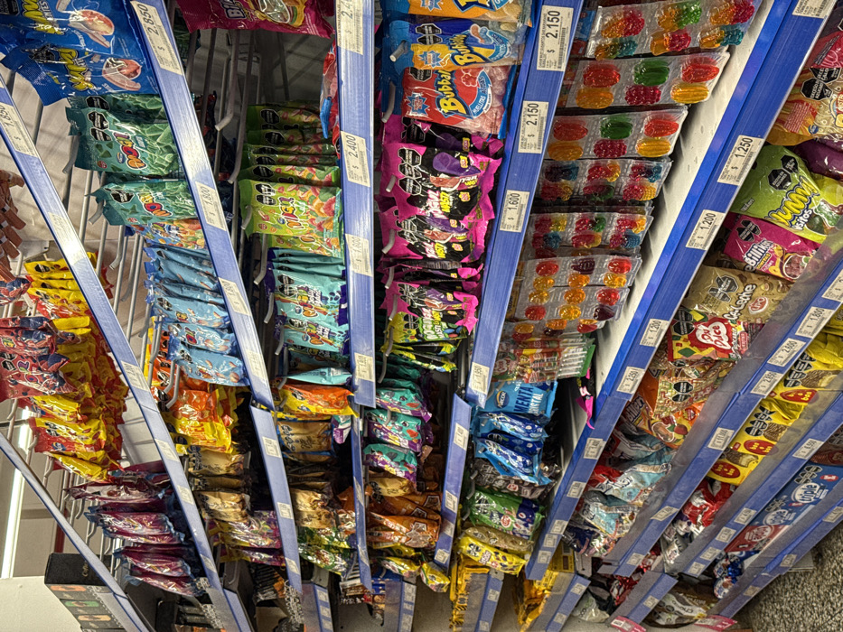 - "The image displays an interior view of a retail store aisle in Ushuaia, Argentina, predominantly featuring confectionery items and snacks" by FM-1uJRt2, licensed under CC BY 4.0