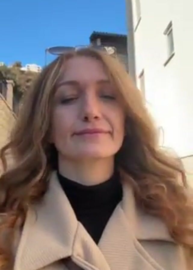 A fair-skinned young woman is recording a video of herself outdoors on a sunny day. She has long, wavy reddish-blonde hair and is wearing a black turtleneck sweater and a beige coat. Sunglasses rest on top of her head. She is looking directly at the camera and smiling slightly as she walks, causing the camera to bob up and down. The backdrop is a narrow street lined with buildings, with a clear blue sky visible above.