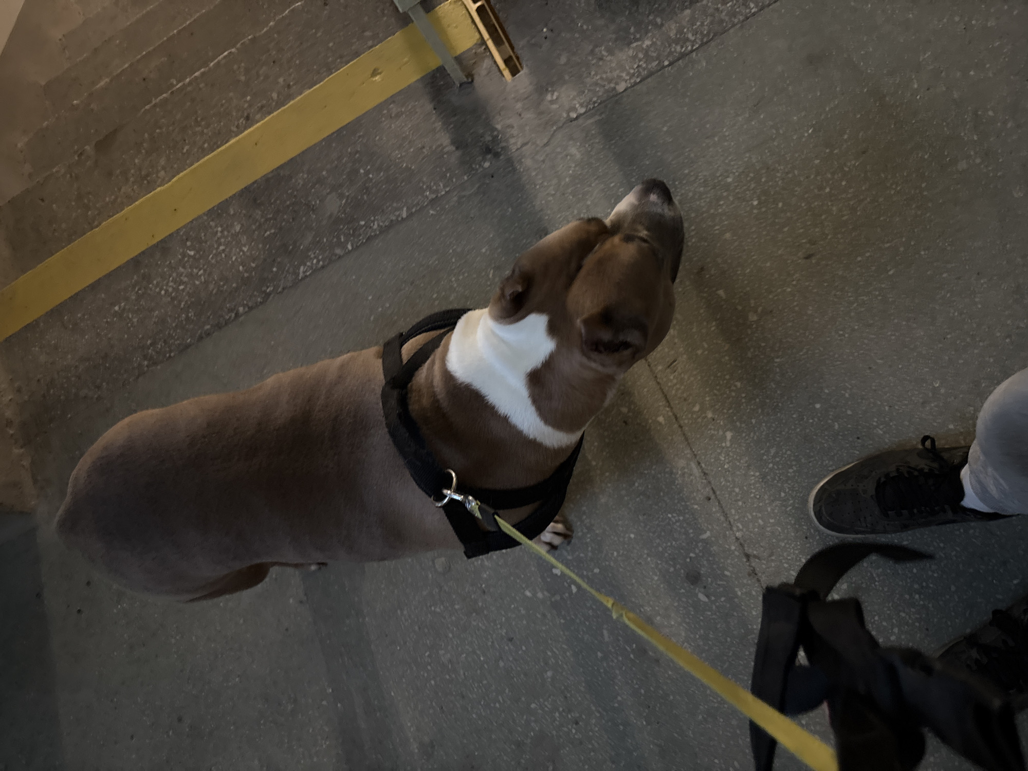 A brown and white dog, appearing to be an American Bully or similar breed, stands on a speckled gray concrete floor. The dog is wearing a black harness to which a yellow leash is attached. The leash extends towards the lower left of the frame, where the left foot of an unseen individual, clad in a black athletic shoe and light-colored pants, is visible. To the right, a set of concrete stairs ascends diagonally, featuring a prominent yellow safety strip painted along the edge of the steps and continuing onto the floor. A metallic or wooden structure, possibly a barrier or lower railing section, partially painted yellow, is present on the stairs. The scene is consistent with an interior public space, specifically an underpass or a platform area within a metro station in Minsk, Belarus. The lighting is low.