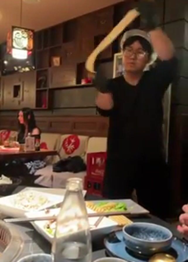 A man in a restaurant is preparing noodles. He's wearing black gloves, a black long-sleeved shirt, and a white hair net. He is stretching a long, flat piece of dough up over his head and down. Other diners are seated at tables nearby, including one woman with dark hair sitting at a table to the left. The table in the foreground has dishes, a bottle of water, and small bowls of sauce. A decorative cabinet with drawers is in the background.