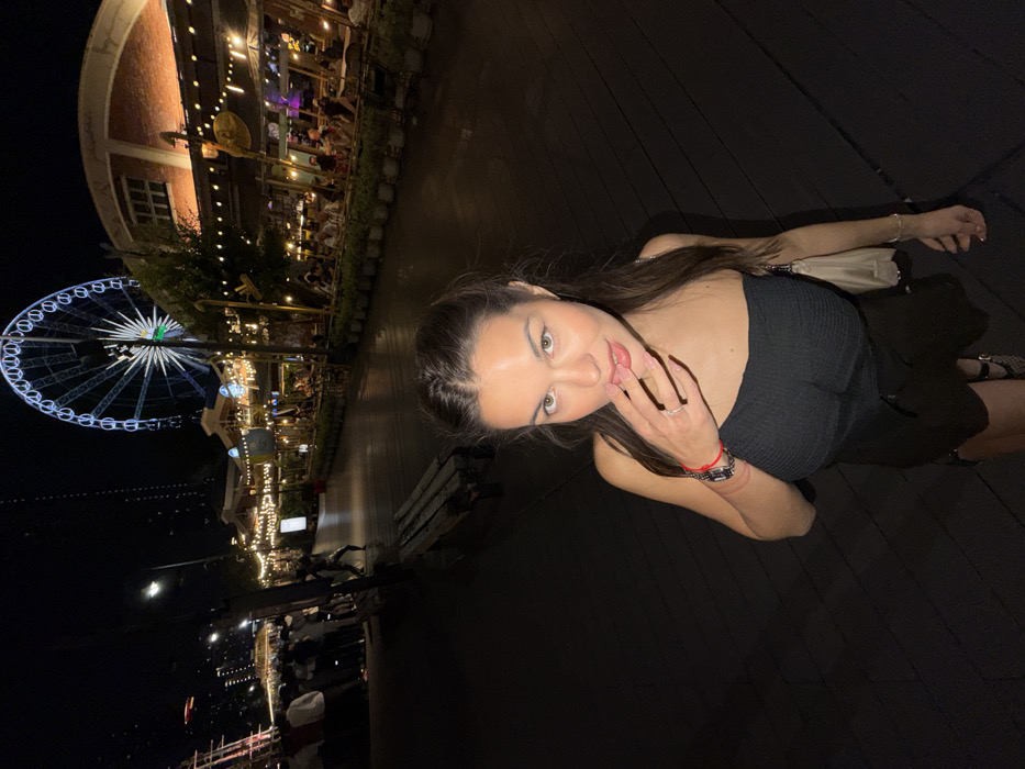 This nighttime image captures a young adult female in the foreground at Asiatique The Riverfront in Bangkok, Thailand. The female, with long dark hair, wears a black strapless top and dark shorts, holding a light-colored shoulder bag on her left side. Her right hand is raised to her mouth, fingers touching her lips, displaying a red string bracelet and a ring on her ring finger. She looks directly towards the camera. Behind her, a dark wooden walkway extends into the midground, where a long wooden bench is visible on the left. Further down the walkway on the left, a group of people are gathered. To the right of the walkway, a row of illuminated outdoor restaurants and shops are active with patrons seated at tables. These establishments are adorned with numerous string lights and feature brick architectural elements. Dominating the background against a dark sky is the brightly lit Asiatique Sky Ferris wheel, its structure glowing with white lights. The scene is illuminated by artificial light sources from the attractions and ambient lighting.