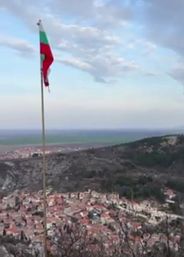 panoramic view of a city from a high vantage point. In the foreground, a Bulgarian flag waves on a pole. Below, the city is spread out with buildings clustered together, many with red-tiled roofs. A river runs through the city. Beyond the city, there is a flat, green landscape fading into the horizon under a cloudy sky. The camera slowly pans upward.
