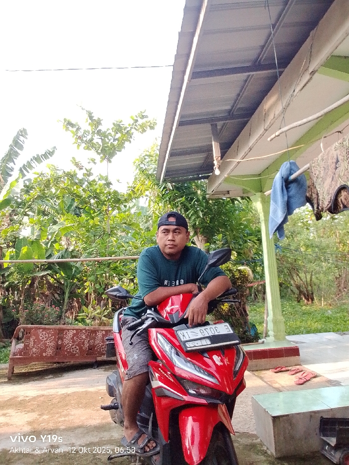 An adult male is seated on a red Honda Vario 150 scooter in an outdoor setting in Jagapura Kidul, Indonesia