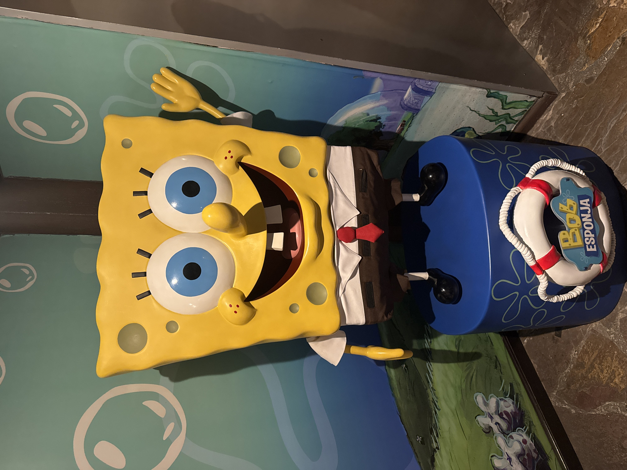 A high-angle shot depicts a SpongeBob SquarePants statue inside a building