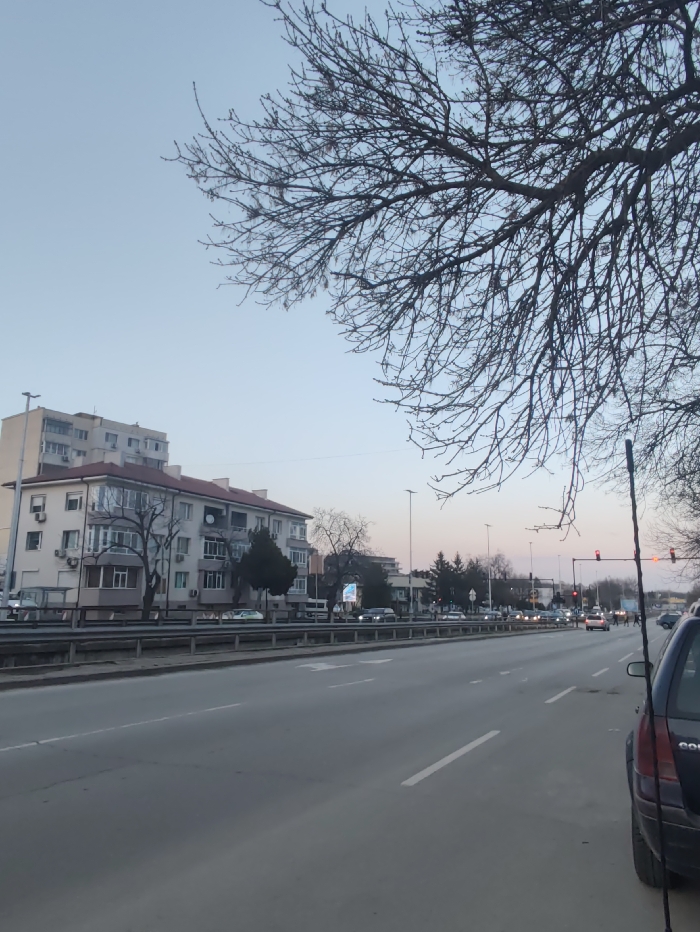 The image captures an urban street scene in Shumen, Bulgaria, at dusk or early evening, characterized by a clear sky transitioning from light blue overhead to a pale orange-pink at the horizon. In the immediate foreground, to the right, the rear portion of a dark-colored compact hatchback vehicle is parked facing away from the viewer. A thin, dark, vertical pole or stick extends upwards from the ground near this vehicle. Overhanging from the upper right, bare, dark branches of a deciduous tree are silhouetted against the sky. The midground features a wide, multi-lane paved road extending into the distance. White lane markings, both solid and dashed, delineate traffic lanes. A concrete median with a metal barrier separates the visible lanes from opposing traffic or a parallel street. Several vehicles with illuminated headlights are visible on the road, moving away from the viewer. Further down the street, on the far side of the median, a large, illuminated digital billboard is visible. Traffic lights are present in the distance, with at least one displaying a red signal for the visible direction of travel. Two pedestrians are discernible in the distance, crossing the street near the intersection controlled by these traffic lights. To the left of the road, a multi-story residential apartment building with a light-colored facade and a reddish-brown roof is visible. This building features multiple balconies and several external air conditioning units. Behind and slightly to the left of this structure, a taller, block-style apartment building with a lighter facade is present. Scattered deciduous trees with bare branches and some evergreen trees line the street and are visible behind the buildings. The background shows the continued urban landscape with more distant buildings and streetlights against the darkening sky.