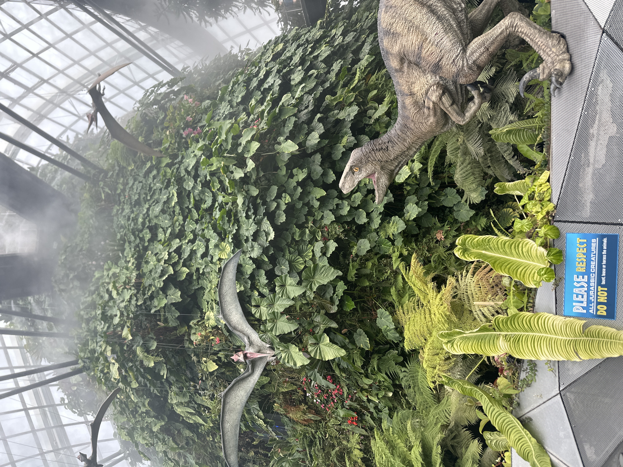 The image depicts an indoor botanical display featuring dinosaur models within the Cloud Forest dome at Gardens by the Bay, Singapore. A massive, conical structure covered densely with various green foliage, including large-leafed plants and ferns, dominates the central and background areas, enveloped in a fine mist. Three artificial dinosaur models are present. Two grey pterosaur models with widespread wings are positioned against the green wall; one in the upper-mid section has an open beak, while the second is visible higher and further back. In the lower-right foreground, a bipedal raptor-like dinosaur model, colored in brown and grey with visible scales, stands with its mouth open, displaying teeth. Its right front claw rests on a grey, perforated metal platform. Various green plants, including ferns and plants with prominent ribbed leaves, are arranged in the foreground. The upper portion of the image reveals the latticed glass and steel framework of the dome's ceiling against a bright, overcast sky. A blue sign in the lower-left foreground bears white text stating: "PLEASE RESPECT ALL JURASSIC CREATURES DO NOT taunt, tease or harass the animals."