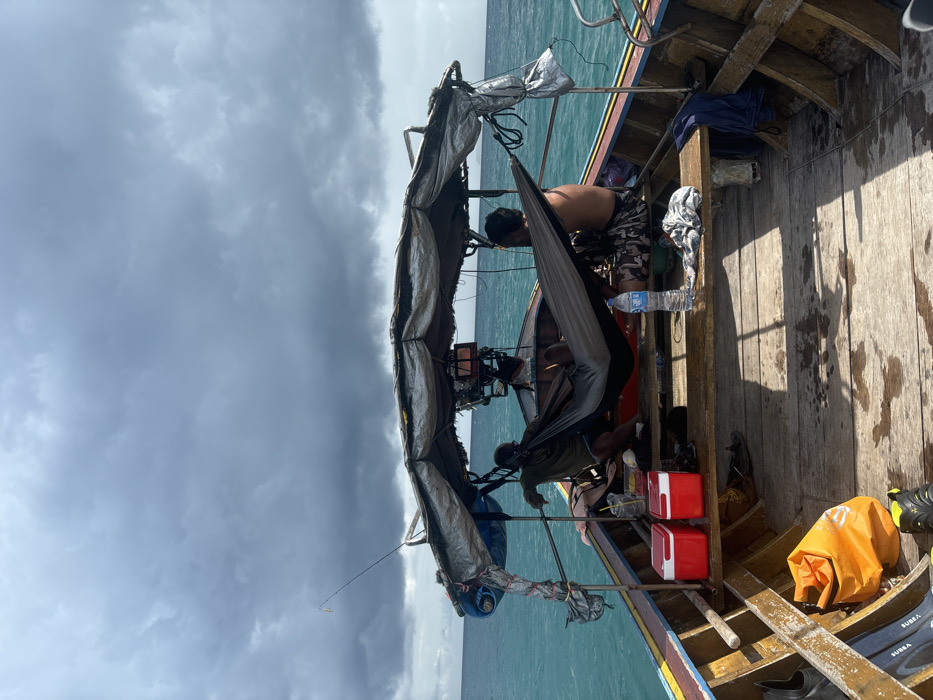interior stern section of a traditional wooden longtail boat in the waters of Ko Tarutao, Thailand. The sky above is heavily overcast with dark grey clouds. The sea is turquoise. Two individuals are under a silver tarp canopy that covers the stern area. One person is reclining in a grey fabric hammock suspended across the boat, positioned on the port side. The second individual is seated on the starboard side, bare-chested and wearing patterned shorts, facing away from the camera. A fishing rod with a yellow tip extends from the boat's port side, just forward of the canopy. Two red and white coolers are situated on a bench on the port side. An orange dry bag and black fins are visible on the port side floorboards in the foreground. A clear plastic water bottle stands on the wooden floorboards between the two individuals. The wooden floorboards are visibly worn and moist.