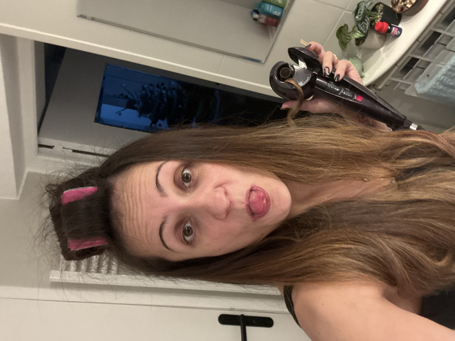 A female subject is depicted in a close-up selfie-style photograph, positioned in an indoor setting identified as Cachan, France. She has long brown hair, with two brown and pink hair rollers secured on top of her head. Her eyes are wide, and she is sticking her tongue out, looking directly at the camera. A small stud nose piercing is visible on her left nostril. She is wearing a dark top. In her left hand, she holds a dark-colored automatic hair curling device, with a strand of her hair partially inserted into its chamber, and a red indicator light visible on the device. Her left hand's fingernails are painted black with white designs, and a faint tattoo is visible on her left forearm. The background features white walls, a black door handle to the left, and a white counter or shelf to the right. On this surface, multiple bottles of personal care products, two potted plants, and a small red and white bottle are visible. Below the counter, a light blue towel is draped. Through an opening, possibly a window or doorway, in the background, a blue-tinted reflection or view reveals a dark, decorated Christmas tree, suggesting the time of year.