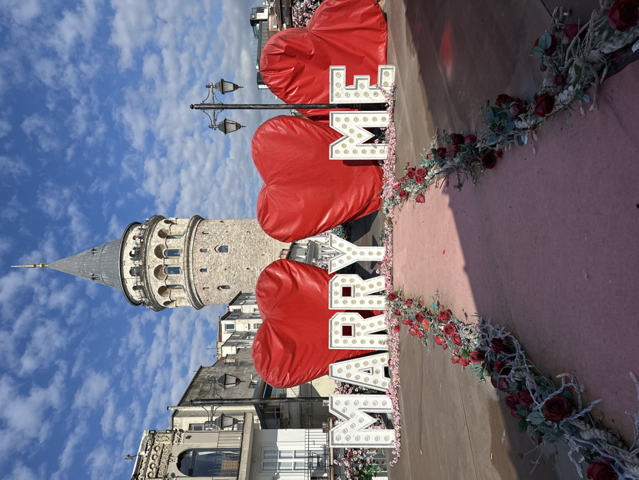 An outdoor scene in Beyoğlu, Istanbul, Turkey, features a romantic display set against the backdrop of the Galata Tower