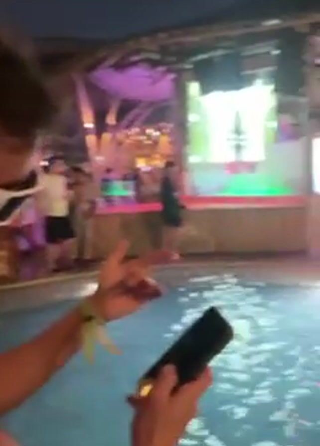 A person with sunglasses and no shirt films a crowd in a pool at night at a club called "Finns"