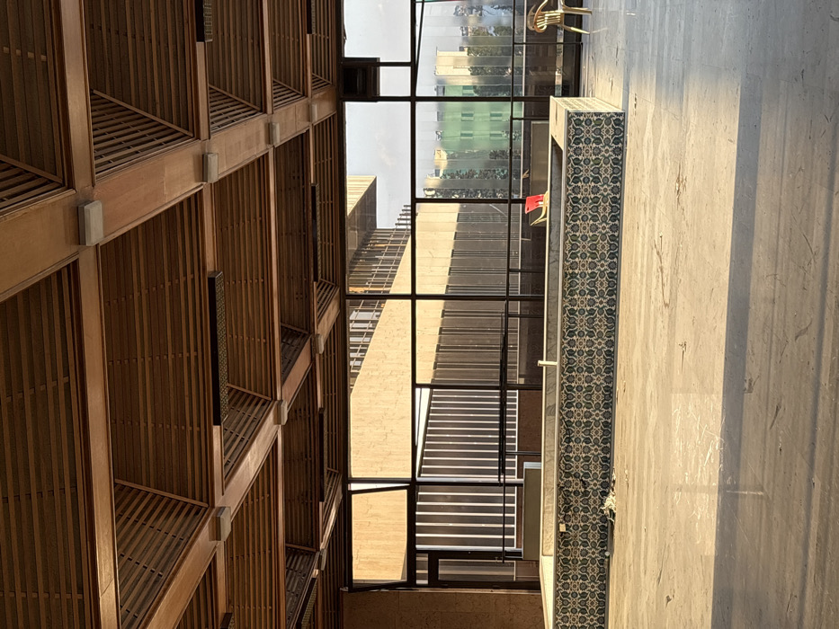 The image depicts an unoccupied interior or semi-enclosed space within Al-Muhajerin Municipality, Syria, illuminated by direct sunlight indicating either morning or late afternoon. The scene is dominated by a patterned wooden ceiling with intersecting beams and slatted panels, equipped with rectangular light fixtures. Large, dark-framed multi-pane windows stretch across the background, offering a view of an urban environment. One window section on the left is partially open, and a glass-paneled door is visible to the far left. In the mid-ground, a rectangular, waist-high structure featuring intricate blue, green, and brown geometric tile patterns along its sides is centrally positioned. Its top surface is light-colored, and an empty basin or trough is visible within, containing what appears to be a white pipe or fixture. A small pile of debris is present on the floor directly in front of the tiled structure's left end. The floor is a light-colored, possibly tiled or concrete, surface reflecting sunlight. Through the windows, multiple buildings are visible. The immediate background features a light-brown building with vertical architectural elements. Further into the urban landscape, additional structures are present, one displaying green reflections. To the right of the tiled structure, behind the windows, a single red chair and a light-colored, possibly wooden, chair are situated. No individuals are present in the scene.
