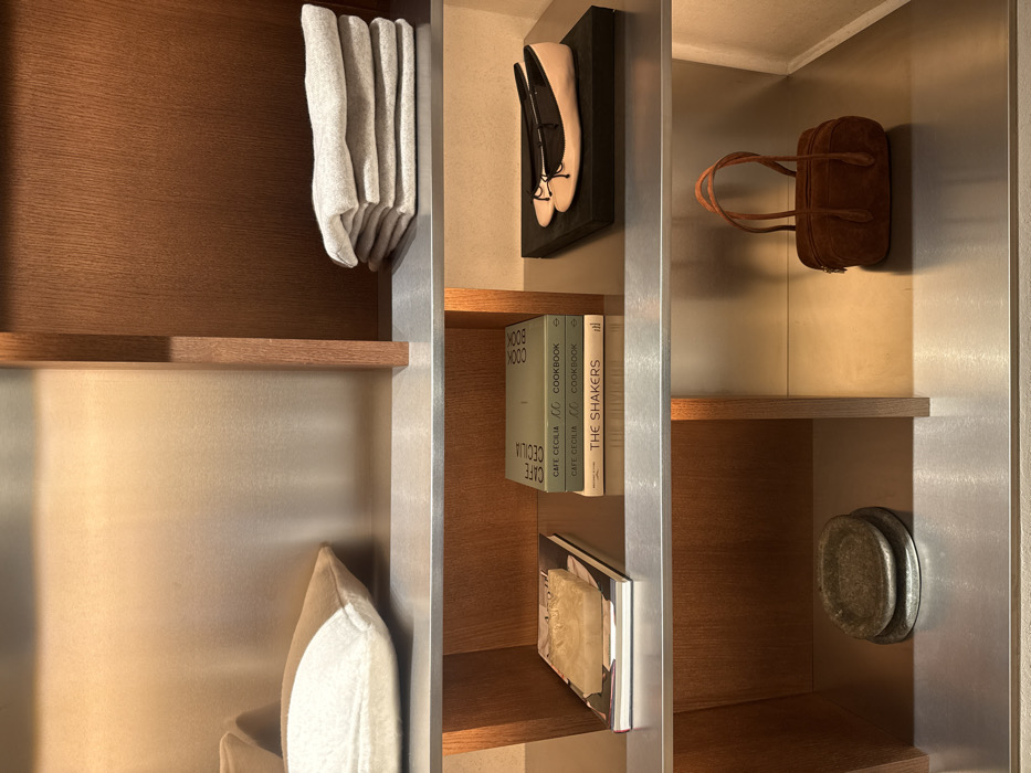 The image displays an interior retail display unit in Barcelona, Spain. The shelving unit consists of metallic shelves and warm-toned wooden vertical dividers and back panels. On the top left shelf, a partially visible cushion with beige and white sections is present. The top right shelf contains a neat stack of four folded light grey textile items. The middle left shelf features a stack of two horizontal books with a light, irregular object placed on top, next to a vertical stack of three books; the top two are green-covered "CAFE CECILIA COOKBOOK" editions, and the bottom is a light-covered book titled "THE SHAKERS." The middle right shelf exhibits a pair of light pink ballet flats with black bows, resting on a black rectangular base. The bottom left shelf holds two stacked dark, textured circular objects. On the bottom right shelf, a small brown suede handbag with two handles is displayed.