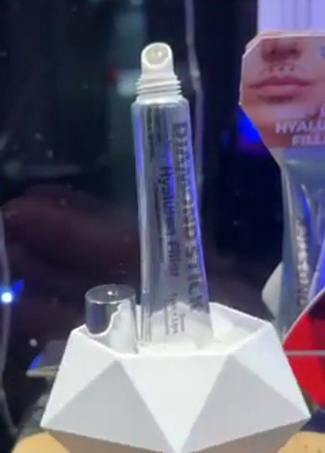 A close-up shot focuses on a silver tube of DIAMONDSTICK Hyaluron Filler, designed for Eyes & Lips, nestled in a white, multifaceted, geometric container filled with white material resembling sand or beads. The cap of the tube rests beside it. The background is dark and slightly blurred, suggesting an enclosed space like a display case. Small blue lights are visible in the background, adding a subtle touch of illumination. To the right of the tube is another product package featuring a picture of lips marked for hyaluronic filler injection.