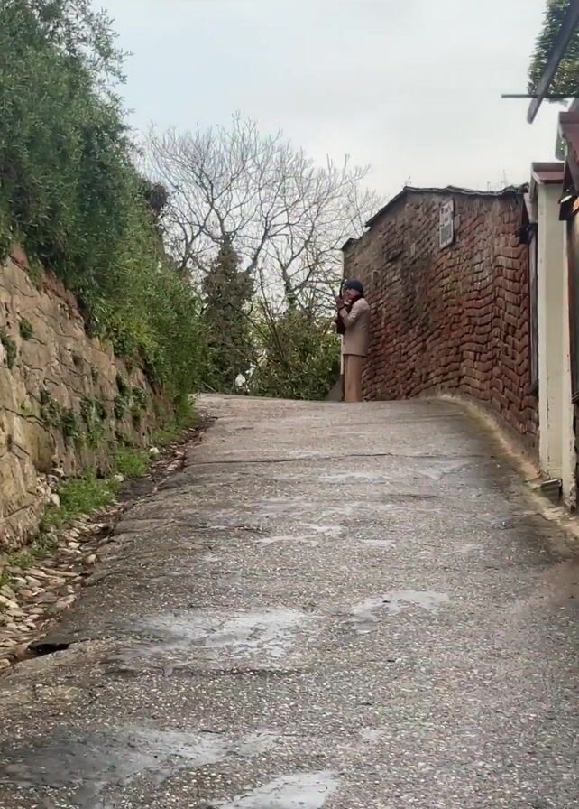 A man stands against a brick building on a wet road, playing a stringed instrument. He wears a suit and a dark cap. To the left of the road is a rock wall covered in foliage, and the sky is overcast.