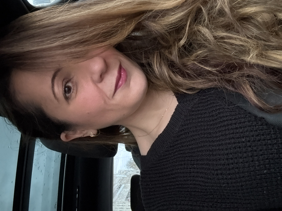 A woman with shoulder-length wavy blonde-brown hair is pictured from the chest up
