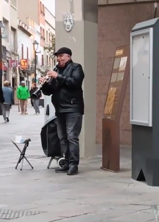 A man is playing a clarinet in an outdoor setting, possibly a town square or pedestrian street