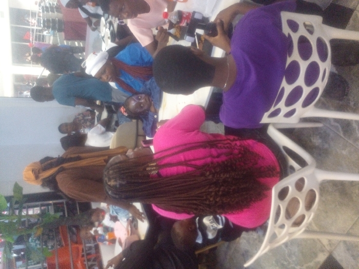 This image depicts a modern, brightly lit indoor dining facility, likely a restaurant or a food court, situated in Lagos, Nigeria. The scene shows multiple groups of people gathered around white rectangular tables, suggesting a casual meal or social event. In the foreground, a woman is seen from behind, wearing a vibrant pink top and long, reddish-brown braided hair. She sits on a white plastic chair with a distinctive open circular pattern on its backrest. A small child in a black and white top is partially visible to her left. To her right, another individual, also seen from behind, wears a plain purple short-sleeved top and a thin silver necklace, seated on an identical white plastic chair, holding a black smartphone. A red beverage bottle is visible on the white table they share. In the midground, a woman in a blue top and white head wrap is seated, facing left, beside a child with white and black face paint (possibly an animal or butterfly design) around the eyes and nose, who rests their chin on the table. To this child's right, another young person wears a light peach or pink top. Further left, a standing individual with a brown top and an orange head wrap is partially visible. Plates with food and various beverage containers are present on the tables. The background shows an expansive open-plan area with numerous blurred figures, additional tables, and a high ceiling. Artificial overhead lighting illuminates the space. A large artificial green plant serves as decoration on the far left. Architectural elements suggest a multi-level design with a glimpse of a railing or staircase on the upper right.