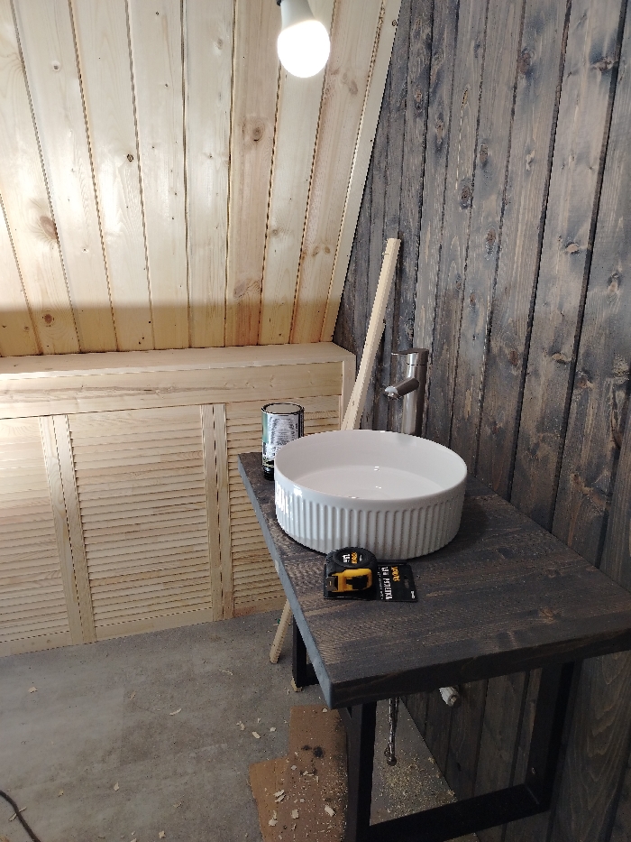 The scene depicts an interior room in Chaikovsky, Russia, appearing to be under construction or renovation. The upper left wall and sloped ceiling are clad in light-toned, unfinished vertical wooden planks. Below this, a light-colored wooden structure with louvered panels extends across the lower wall. The right wall is covered in dark-stained or weathered vertical wooden planks. An exposed, illuminated incandescent light bulb hangs from the ceiling in the upper center. In the foreground-right, a dark-stained wooden vanity table stands against the dark wooden wall. A white, fluted, circular ceramic basin is placed on the vanity surface. Behind the basin, a cylindrical metallic faucet is mounted directly on the dark wooden wall. To the left of the basin, a black cylindrical can with a visible label rests on the vanity. In front of the basin, a yellow measuring tape is positioned on black retail packaging. A light-colored wooden slat leans vertically against the dark wall, to the right of the vanity. The floor is a rough concrete surface, littered with wood shavings and a piece of cardboard. A black electrical cord is visible on the floor in the lower left corner. No individuals are present.
