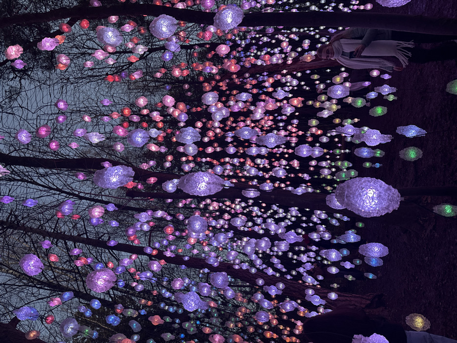 The image captures a nighttime outdoor light art installation within Frogner Park, Oslo, Norway. Thousands of translucent, textured light fixtures, primarily spherical, ovoid, and teardrop-shaped, are suspended at various heights from the bare branches of deciduous trees and from ground-level poles. These lights emit an array of colors including purple, magenta, red, blue, and green, creating a dense, luminous canopy. Dark tree trunks and branches are visible as silhouettes against a dim, cool-toned sky. The ground below is dark, appearing as bare earth or fallen leaves. A fair-skinned individual, wearing a light-colored scarf and a dark jacket, is positioned in the lower right quadrant, holding a smartphone with both hands and gazing at its screen. A partial figure is present in the lower-left corner of the frame. The scene is entirely illuminated by the artificial light sources.